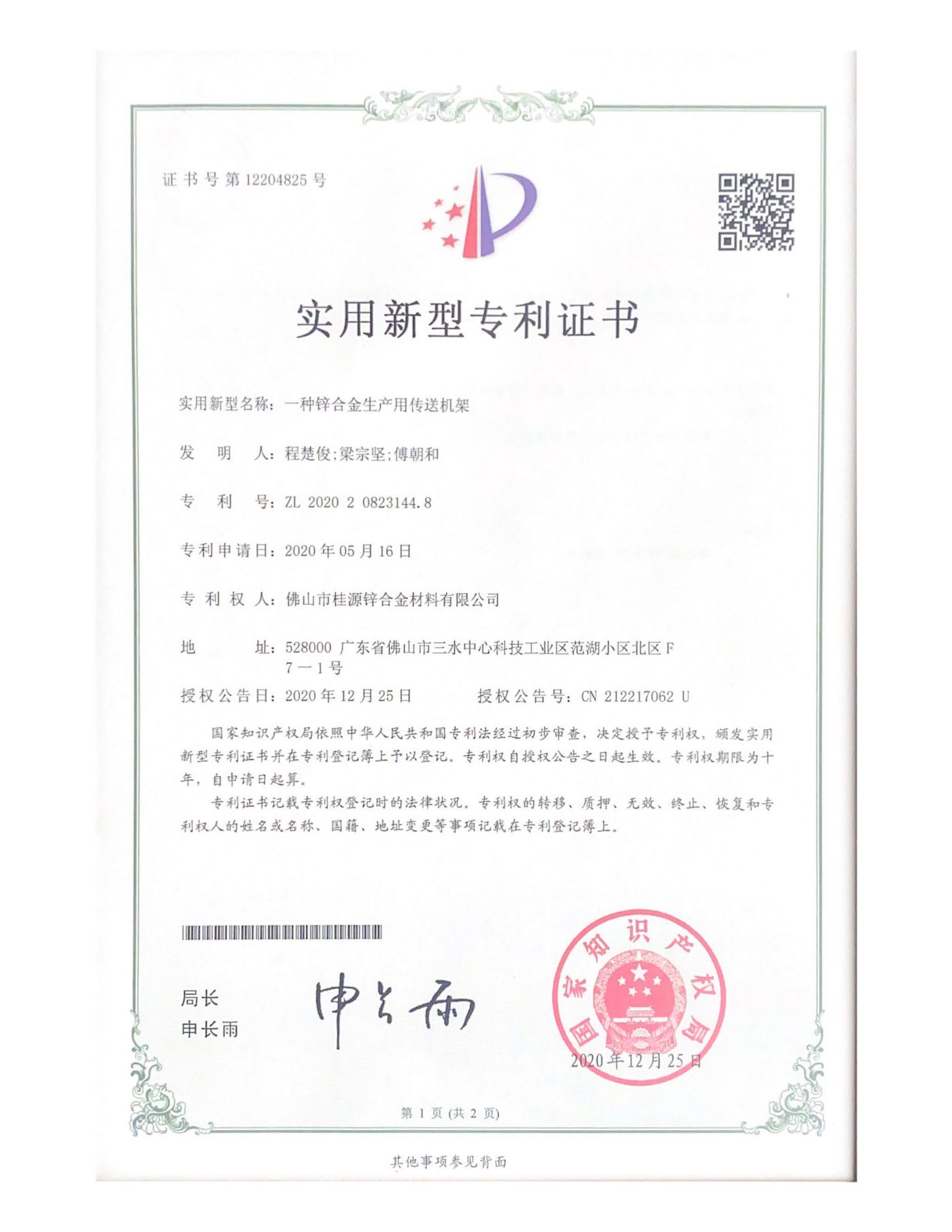 實(shí)用新型專利《一種鋅合金生產(chǎn)用傳送機(jī)架》