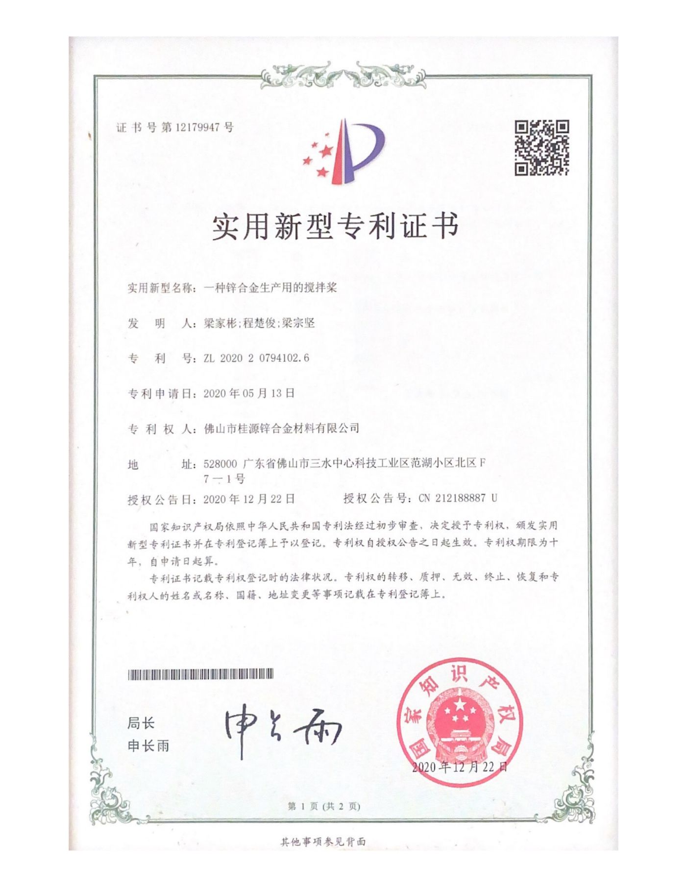 實(shí)用新型專利《一種鋅合金生產(chǎn)用的攪拌槳》
