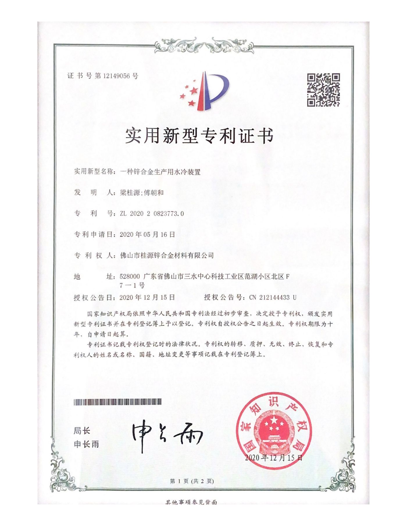 實(shí)用新型專利《一種鋅合金生產(chǎn)用水冷裝置》