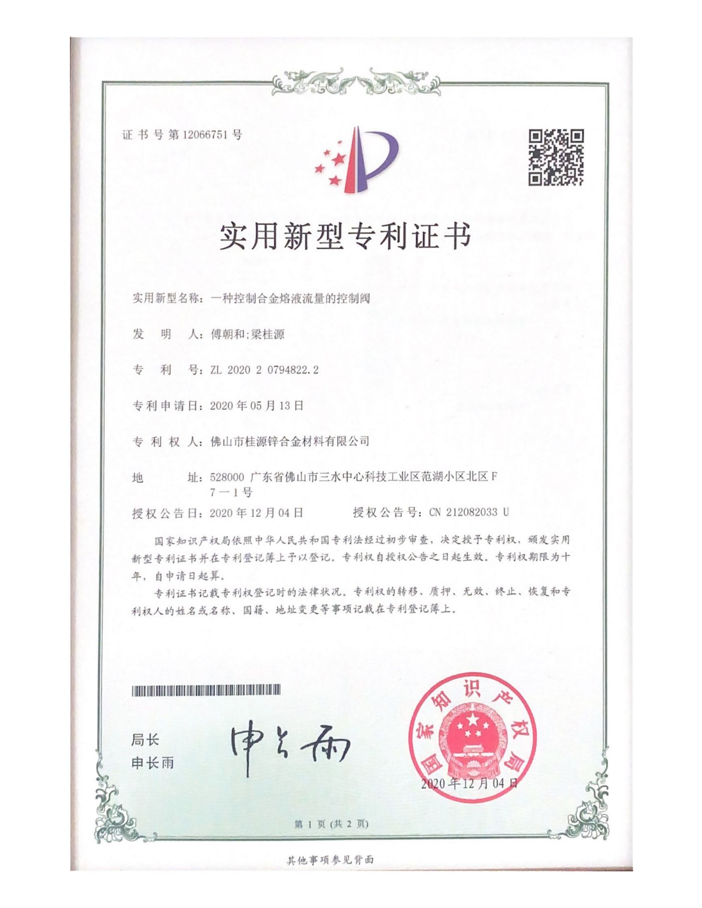 實(shí)用新型專利《一種控制合金熔液流量的控制閥》