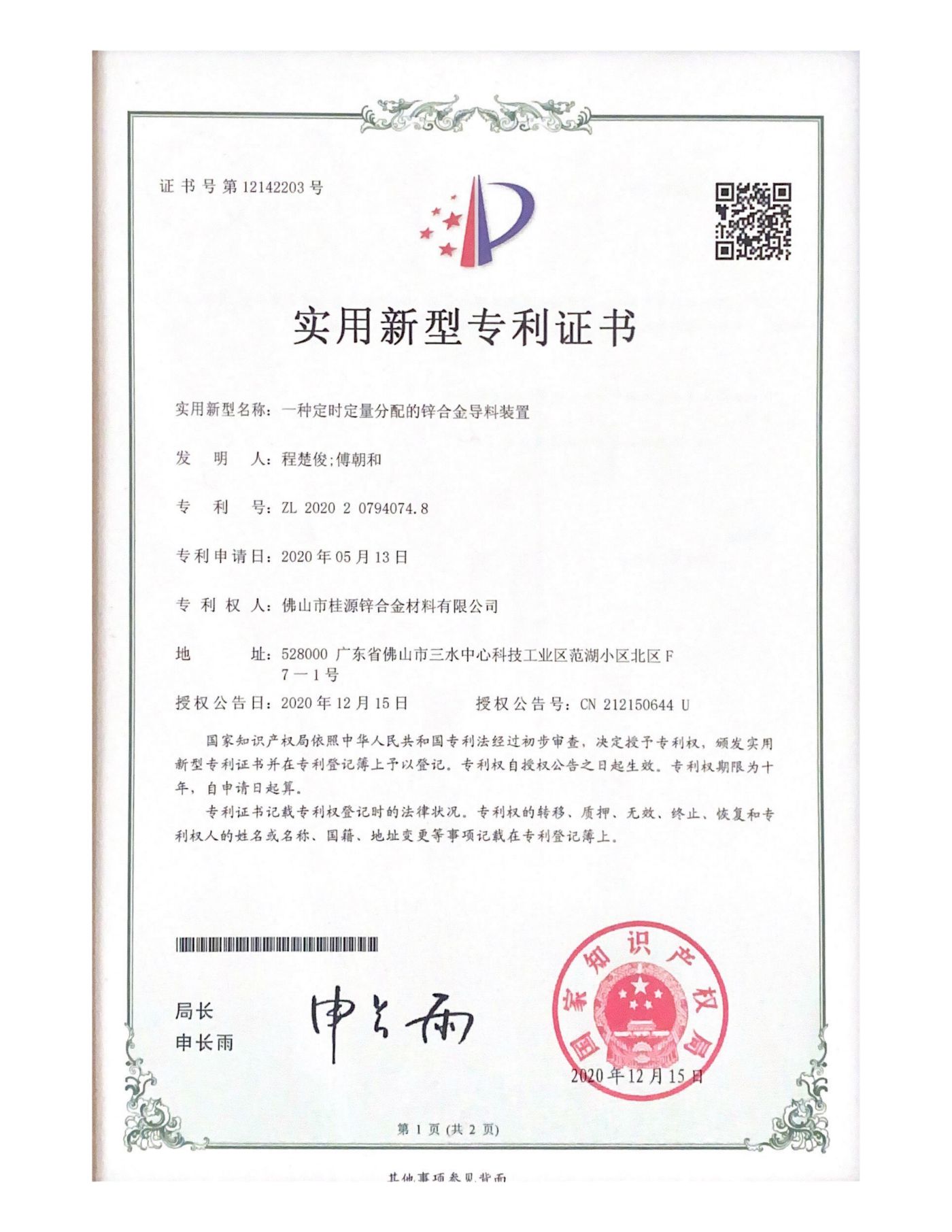 實(shí)用新型專利《一種定時定量分配的鋅合金導(dǎo)料裝置》