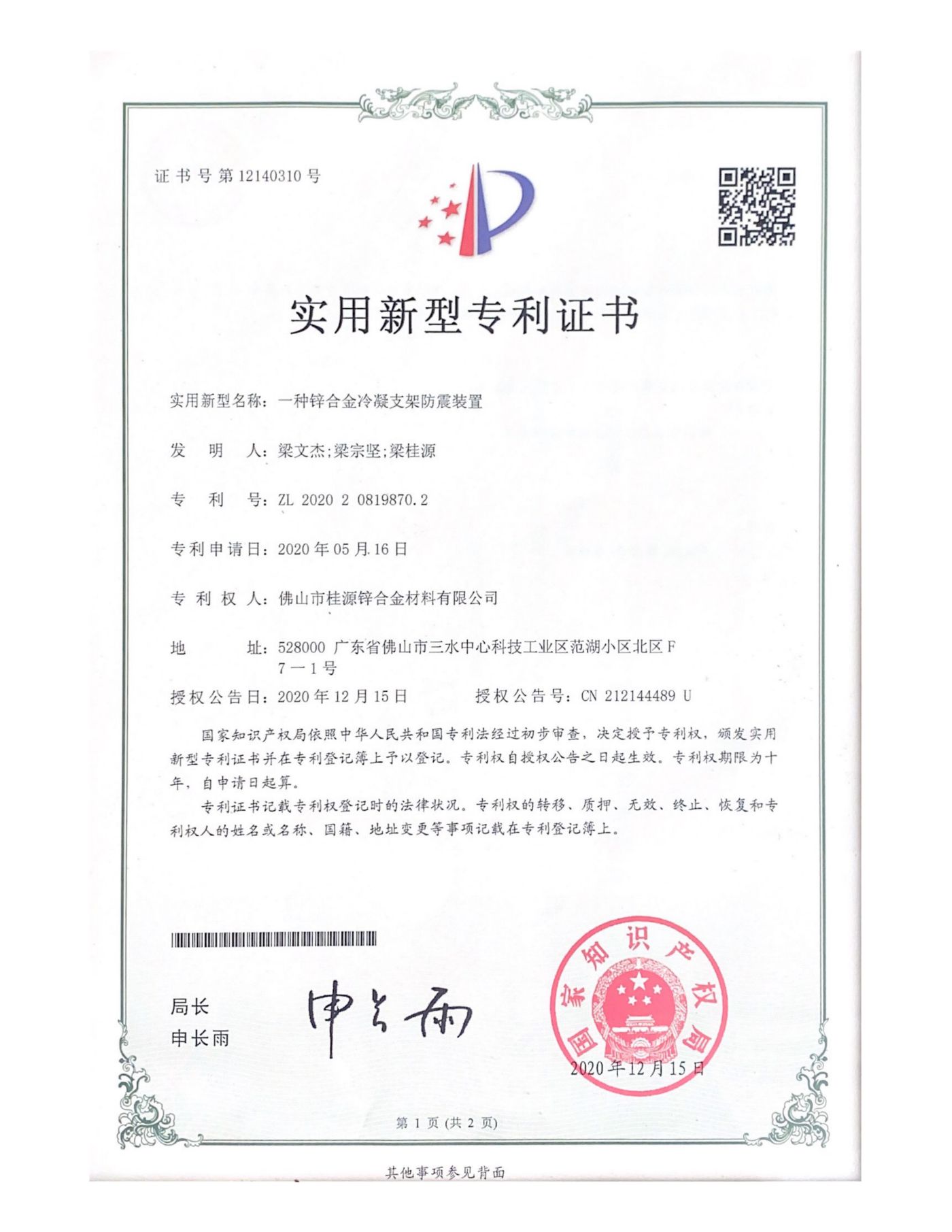 實(shí)用新型專利《一種鋅合金冷凝支架防震裝置》